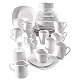 Elegantes, weißes Geschirr-Set in edler Form. Spülmaschinen- und mikrowellengeeignet. Material: Porzellan. Bestehend aus: 6 flachen Tellern (je ca. 25 cm Ø), 6 tiefen Tellern (je ca. 21,5 cm Ø), 6 Desserttellern (18,5 cm Ø), 6 Müslischalen (ca. 7 cm hoch, 14 cm Ø), 6 Obstschalen (ca. 14 cm hoch, 4,5 Ø), 6 Kaffeebechern (ca. 11 cm hoch, 8 cm Ø), 6 Tassen (ca. 7 cm hoch, 8 cm Ø), 6 Untertassen (ca. 14,5 cm Ø), 6 Eierbechern (ca. 7 cm hoch, 4,5 cm Ø), 1 Milchkännchen (ca. 7,5 cm hoch, 7,5 cm Ø), 1 Zuckertopf (7 cm hoch, 9 cm Ø) und 1 Servierplatte (ca. 27,5 cm Ø).