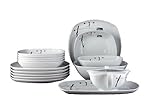 - bestehend aus: 6x Speiseteller eckig 26 cm, 6x Suppenteller eckig 21 cm, 1x Sauciere 0,60 l, 1x Platte eckig 31 cm, 1x Schüssel eckig 20 cm, 1x Schüssel eckig 24 cm